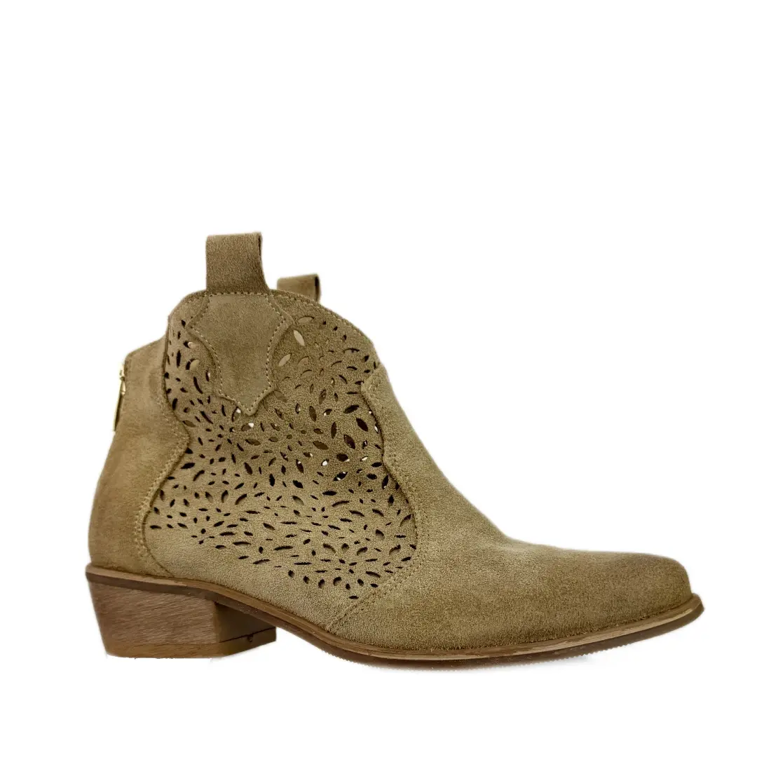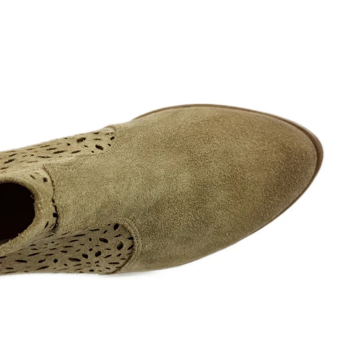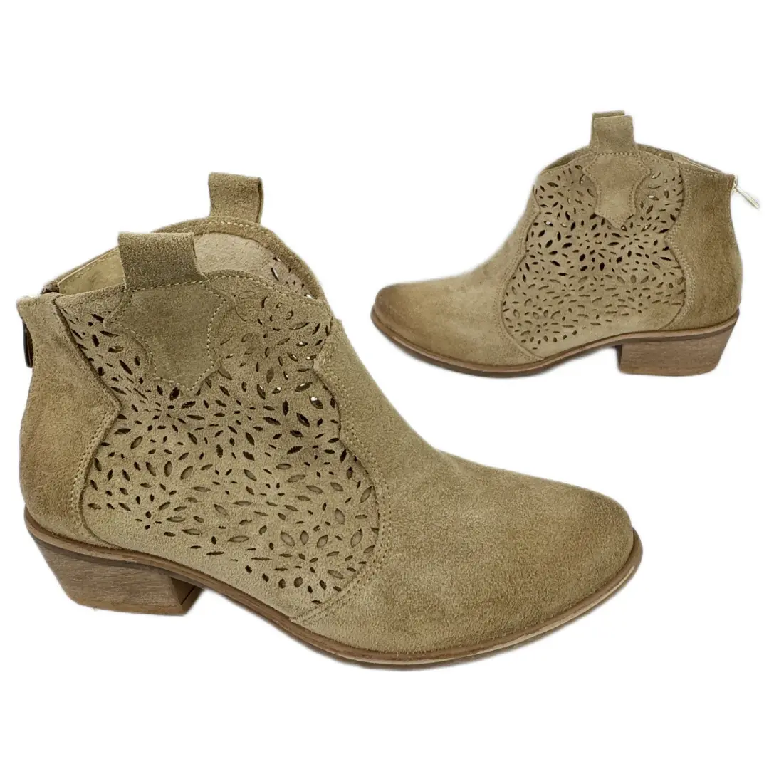 Eleganckie i stylowe botki damskie Exquisite 1130 w uniwersalnym odcieniu beżu, wykonane z wysokiej jakości naturalnej skóry oraz miękkiego weluru, zapewniającego komfort i trwałość. Klasyczny design z noskiem do szpica nadaje im elegancki charakter, idealny zarówno na co dzień, jak i na specjalne okazje.