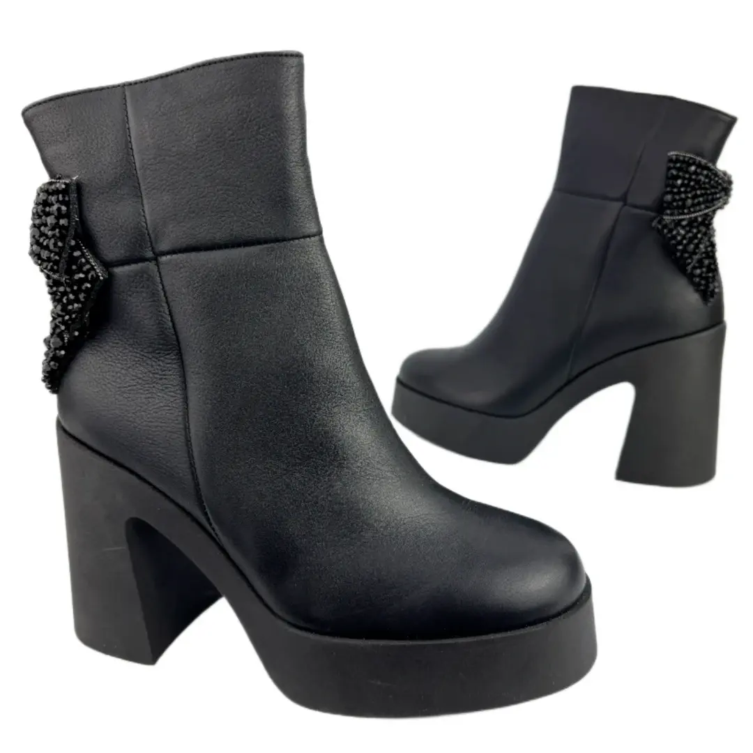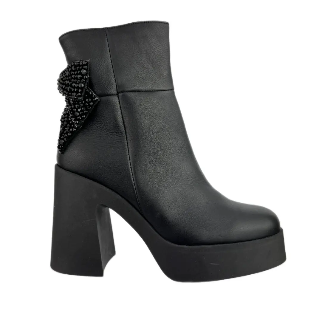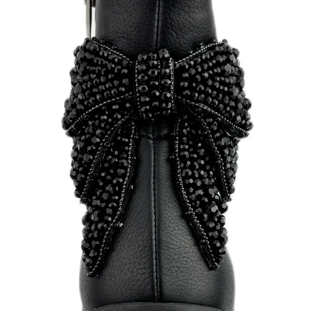 Model wyróżnia się efektowną kokardą 3D wyszywaną kamieniami, umieszczoną z tyłu buta – to wyjątkowa dekoracja, która dodaje całości charakteru i podkreśla kobiecy styl. Ocieplane wnętrze zapewnia komfort cieplny nawet w chłodniejsze dni, a zapięcie na zamek ułatwia szybkie zakładanie i zdejmowanie.