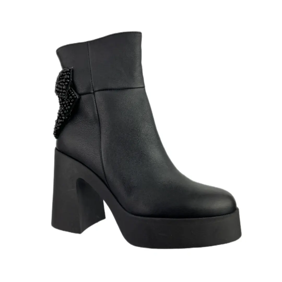 Botki damskie Higo 2612 – czarne skórzane botki z kokardą 3D i ociepleniem