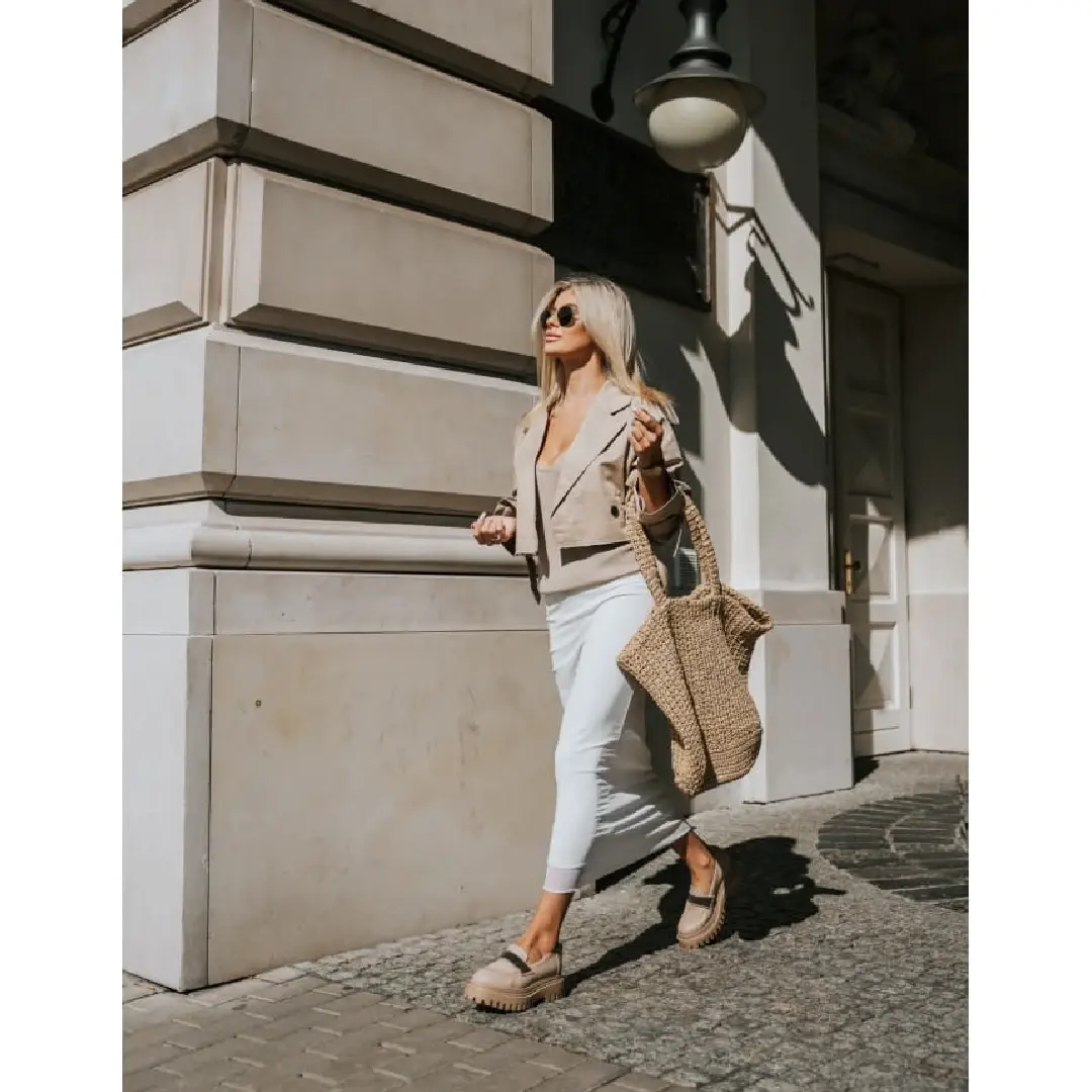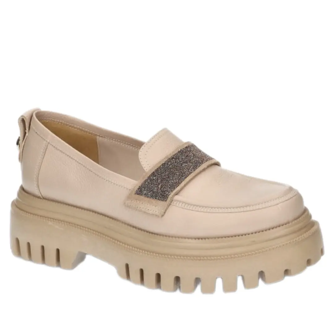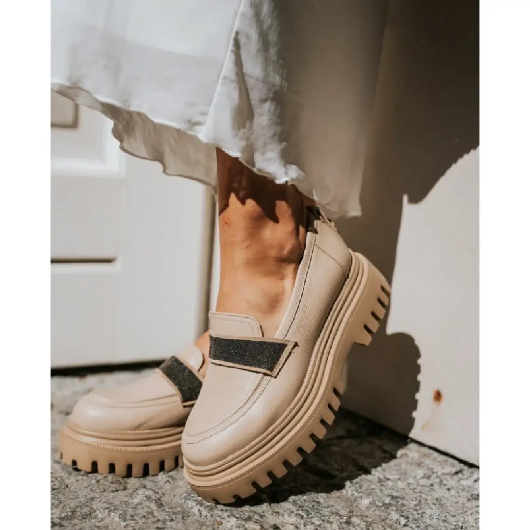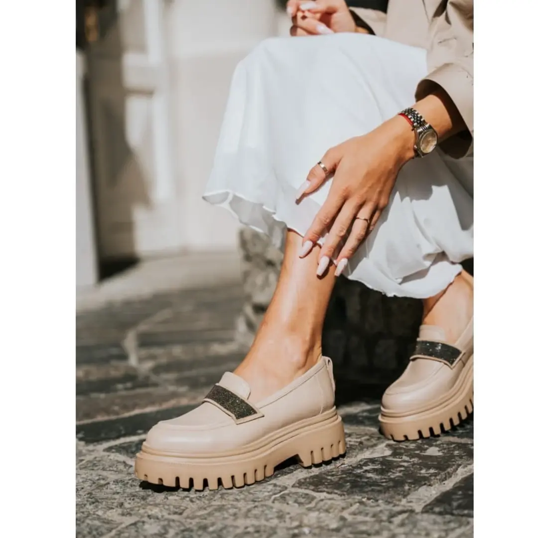 Klasyczne mokasyny w kolorze ciepłego beżu to propozycja idealnie wpasowująca się w aktualnie panujące trendy. Wykonane z najlepszej jakości skóry licowej. Prosta linia cholewki ozdobiona została wyjątkową ozdobą w postaci mieniącego paska na podbiciu, przez co nadaje całości wyjątkowego charakteru. Stabilna podeszwa zapewnia komfort użytkowania i pełną stabilizację stopy. Wsuwane mokasyny to idealna propozycja nie tylko na co dzień.