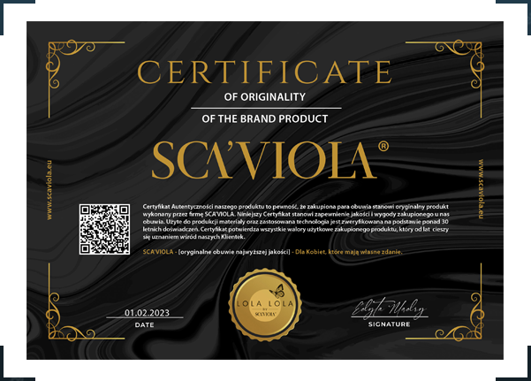 Certyfikat Autentyczności naszego produktu to pewność, że zakupiona para obuwia stanowi oryginalny produkt wykonany przez firmę SCA’VIOLA. Niniejszy Certyfikat stanowi zapewnienie jakości i wygody zakupionego u nas obuwia. Użyte do produkcji materiały oraz zastosowana technologia jest zweryfikowana na podstawie ponad 30 letnich doświadczeń. Certyfikat potwierdza wszystkie walory użytkowe zakupionego produktu, który od lat cieszy się uznaniem wśród naszych Klientek.
