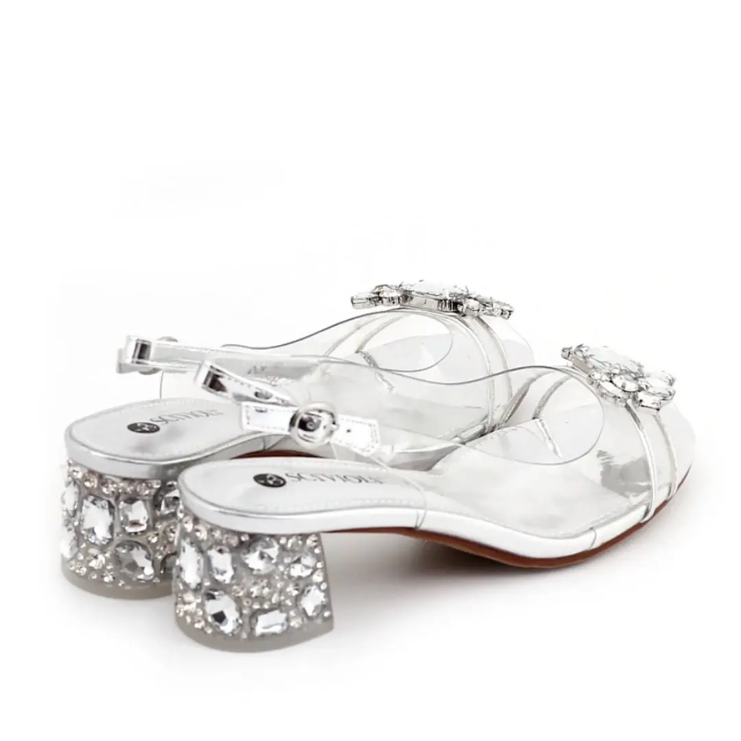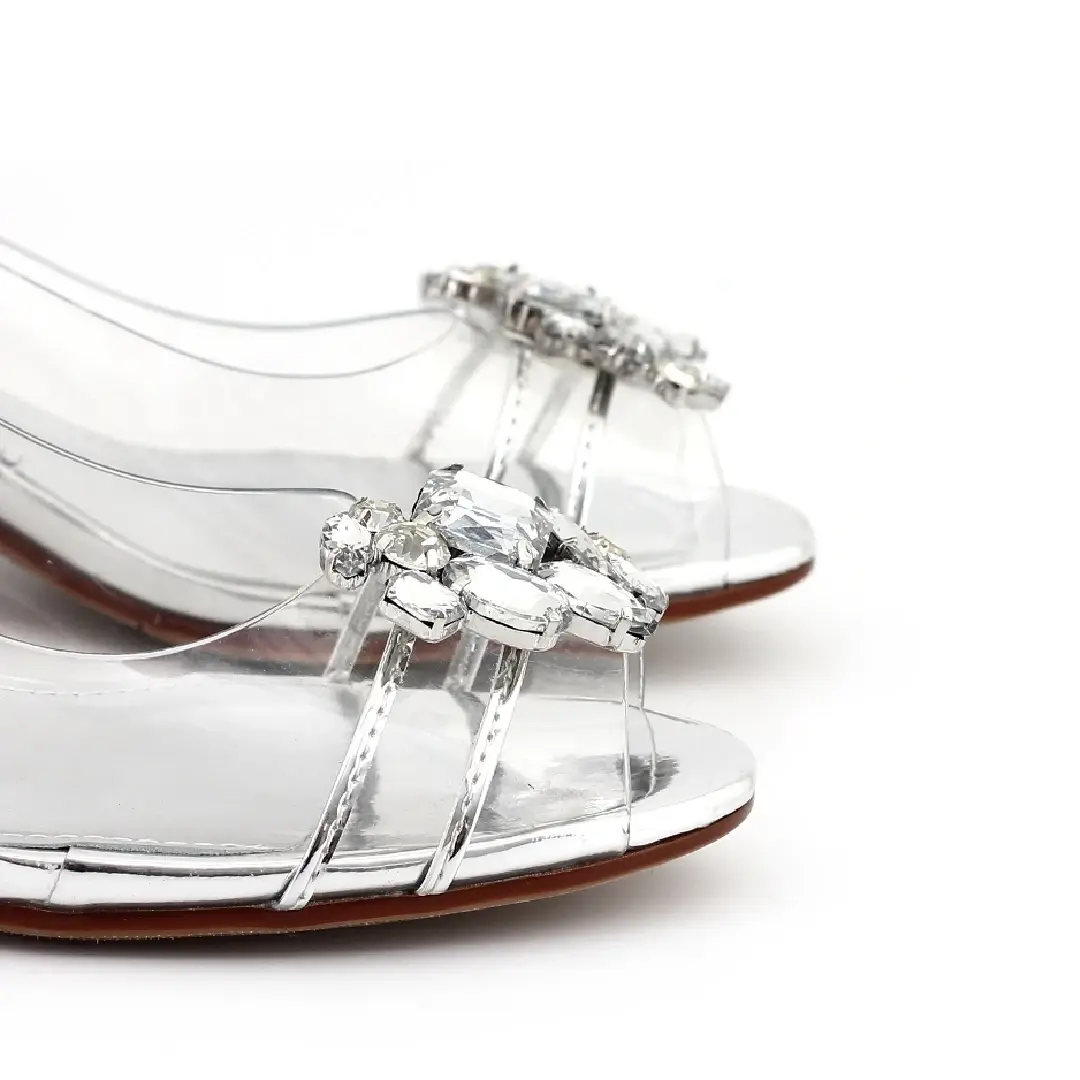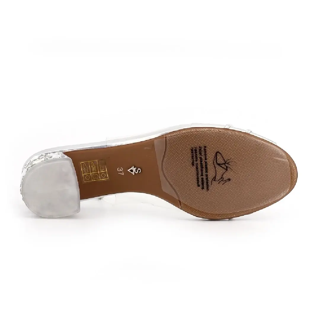 Efektowne zdobienie w postaci szklanej ozdoby dodaje im luksusowego charakteru, podkreślając unikalny design. Stabilny, transparentny obcas o wysokości 5 cm zapewnia wygodne i pewne chodzenie, a antypoślizgowa podeszwa z wysokogatunkowego materiału zwiększa bezpieczeństwo użytkowania.