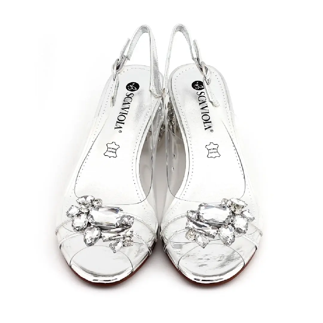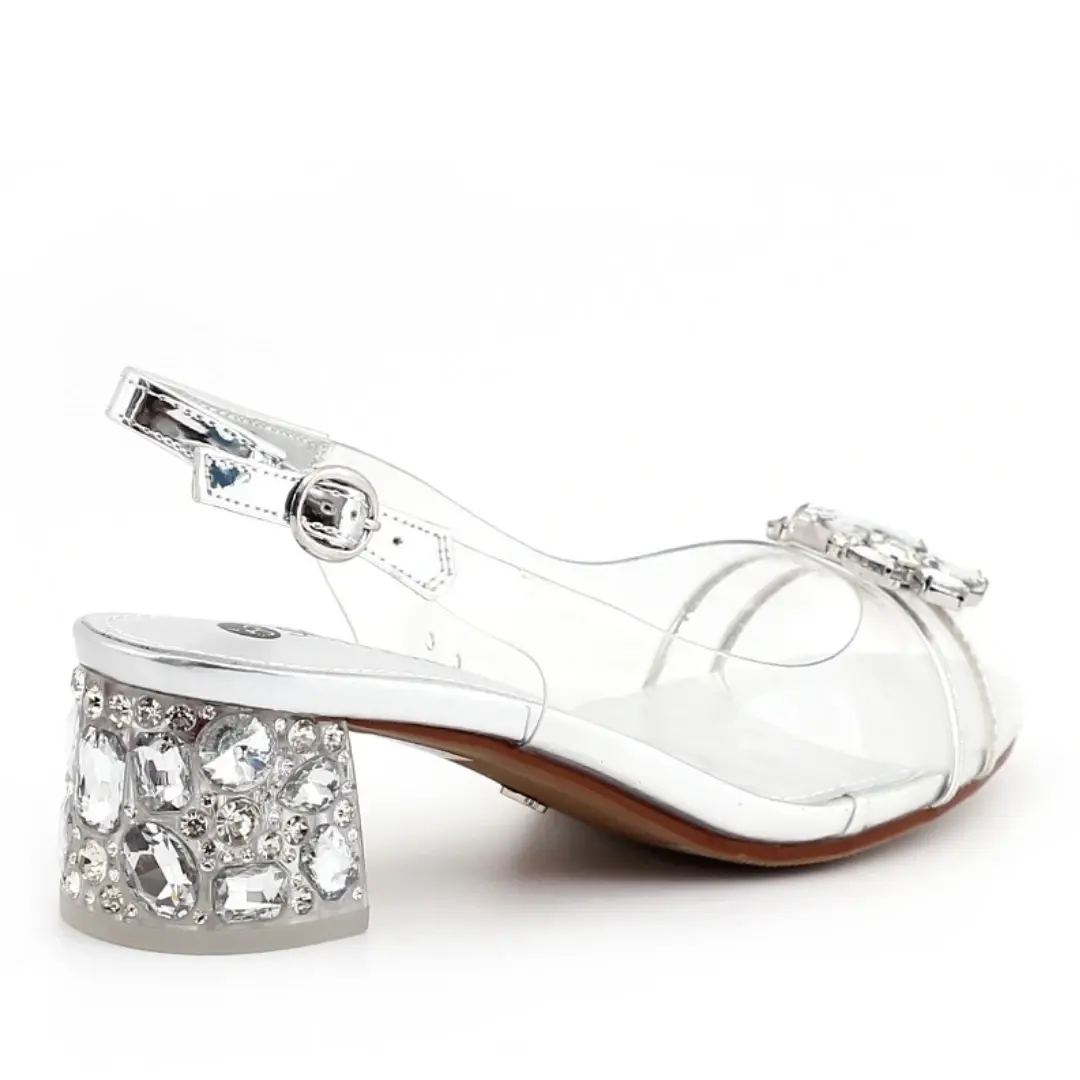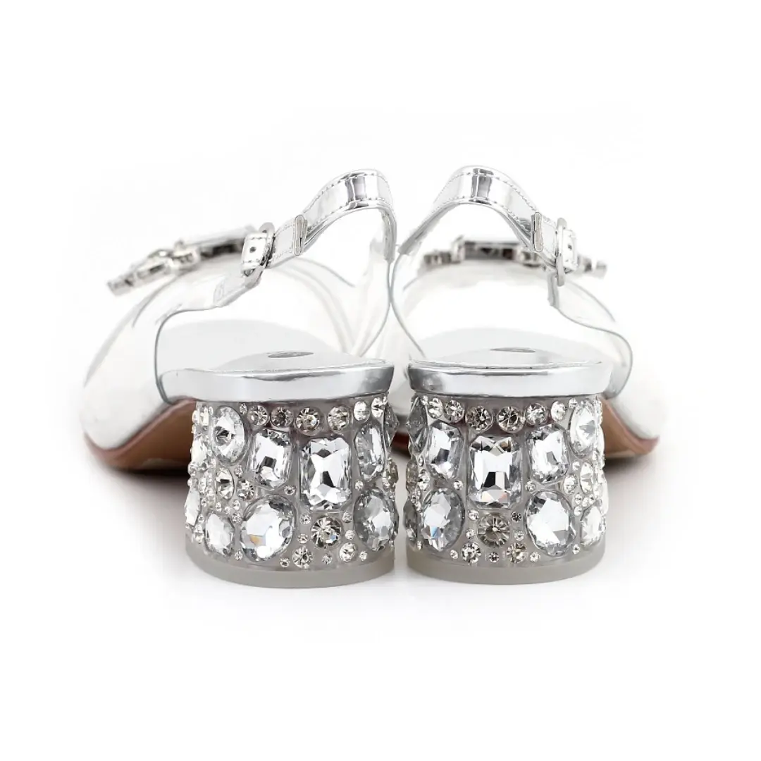 Efektowne zdobienie w postaci szklanej ozdoby dodaje im luksusowego charakteru, podkreślając unikalny design. Stabilny, transparentny obcas o wysokości 5 cm zapewnia wygodne i pewne chodzenie, a antypoślizgowa podeszwa z wysokogatunkowego materiału zwiększa bezpieczeństwo użytkowania.