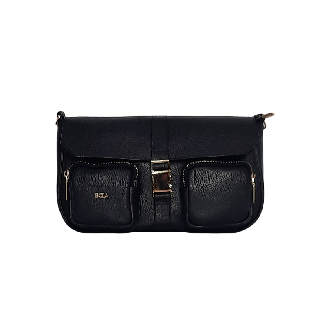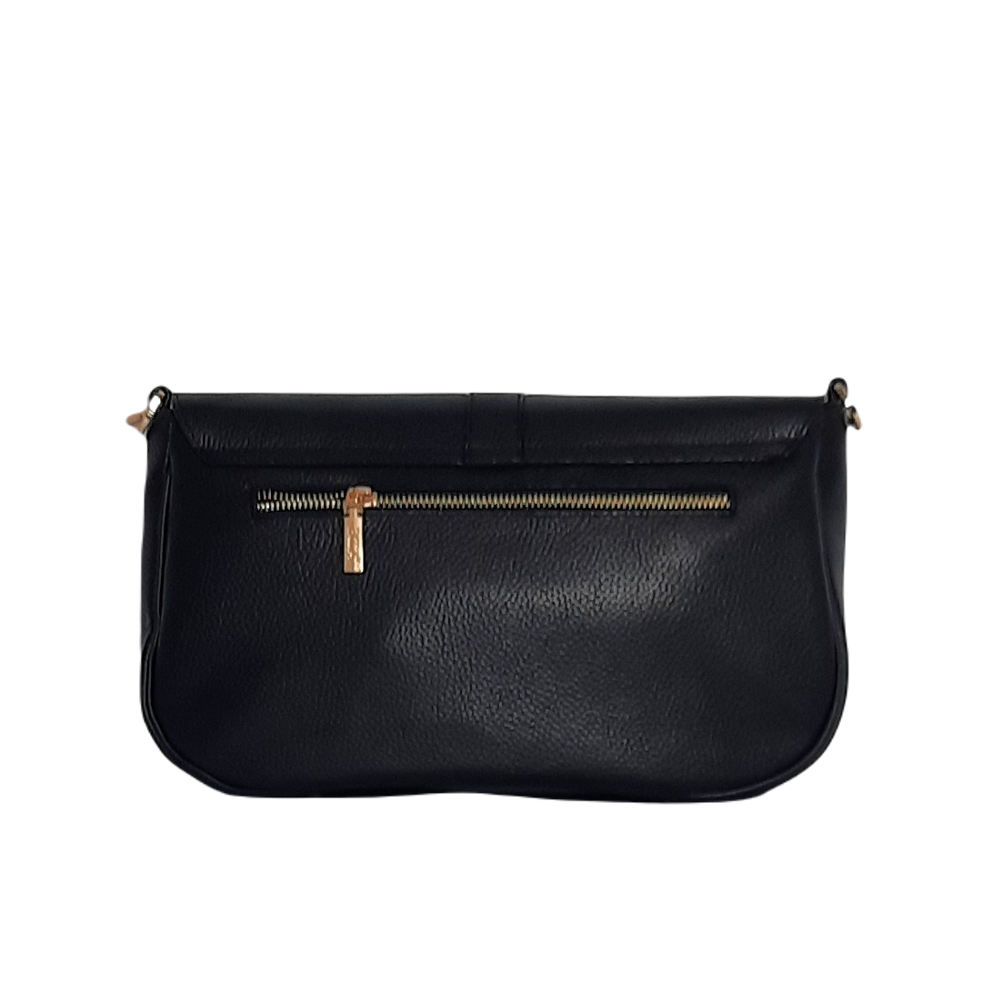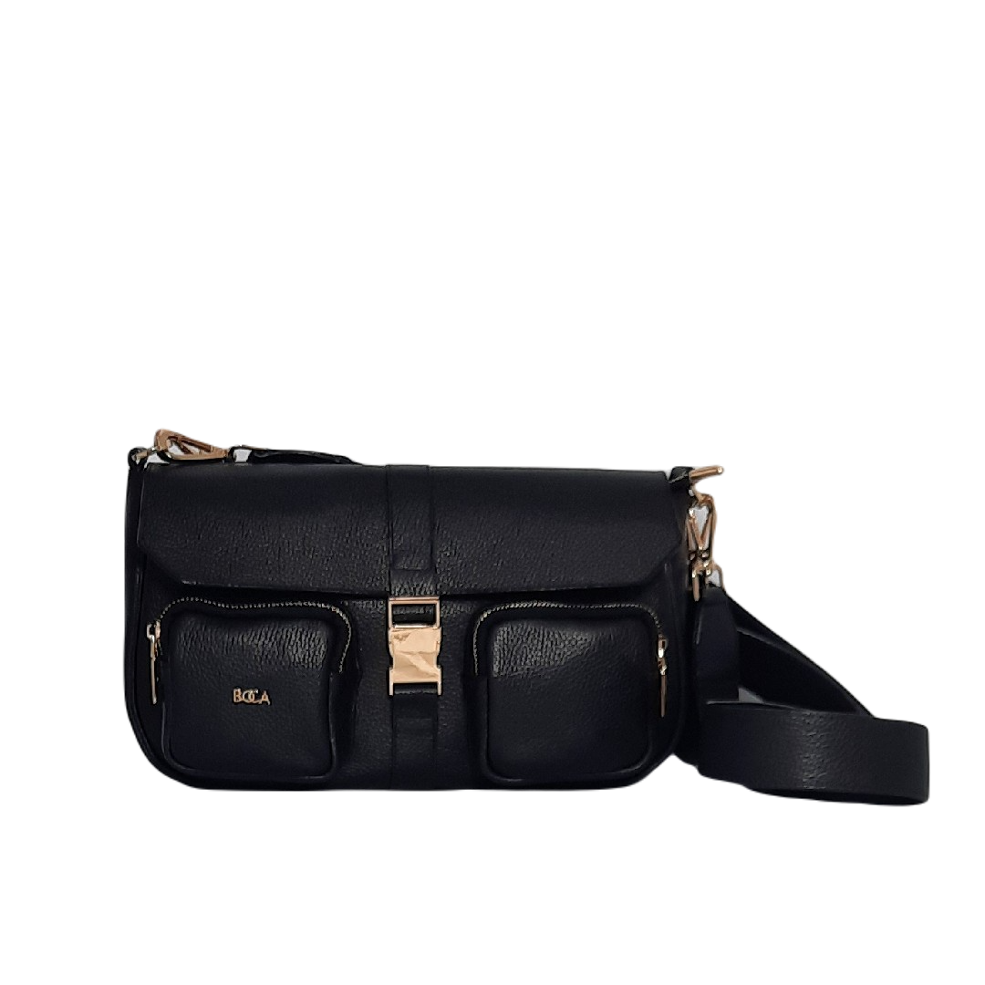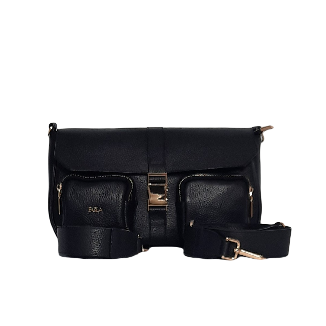 Średnia torebka skórzana w kolorze czarnym posiada dwa paski krótki szerszy i cieńszy długi regulowany .