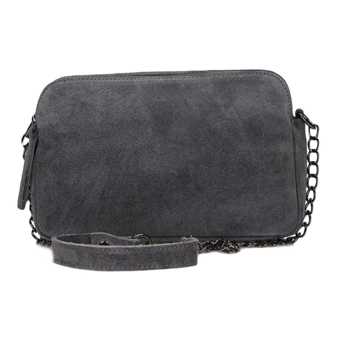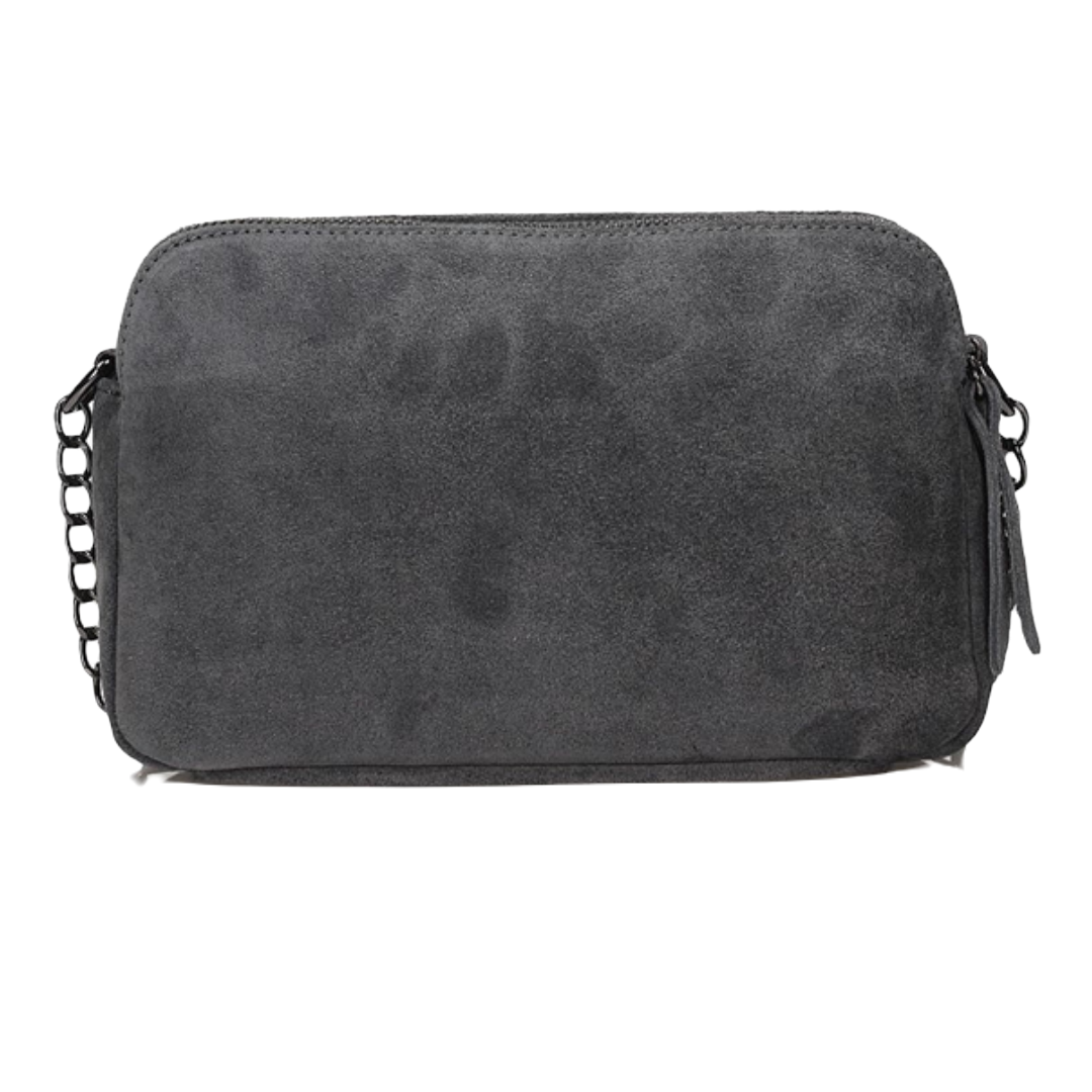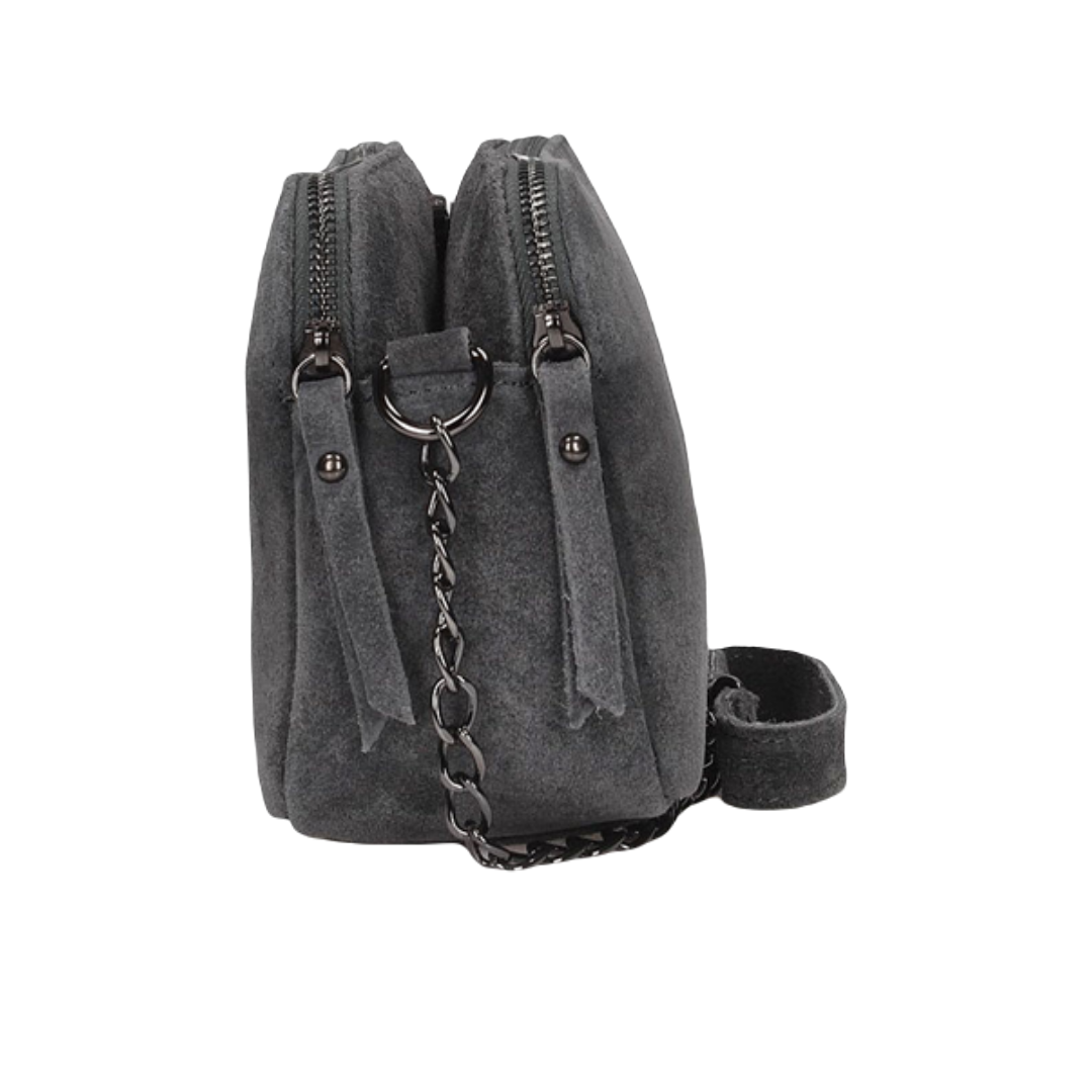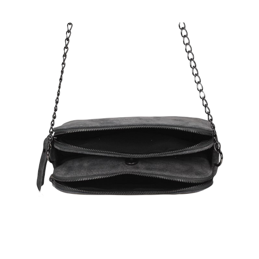 Elegancka torebka wykonana z naturalnej, zamszowej, włoskiej skóry. Dzieli się na trzy główne komory, w tym dwie na zamek i jedna na klips. Dno przedmiotu jest usztywniane. Produkt zawieszony jest na łańcuszku z zamszową wstawką na ramię. Jedna z komór wyposażona jest w mniejszą przegródkę.