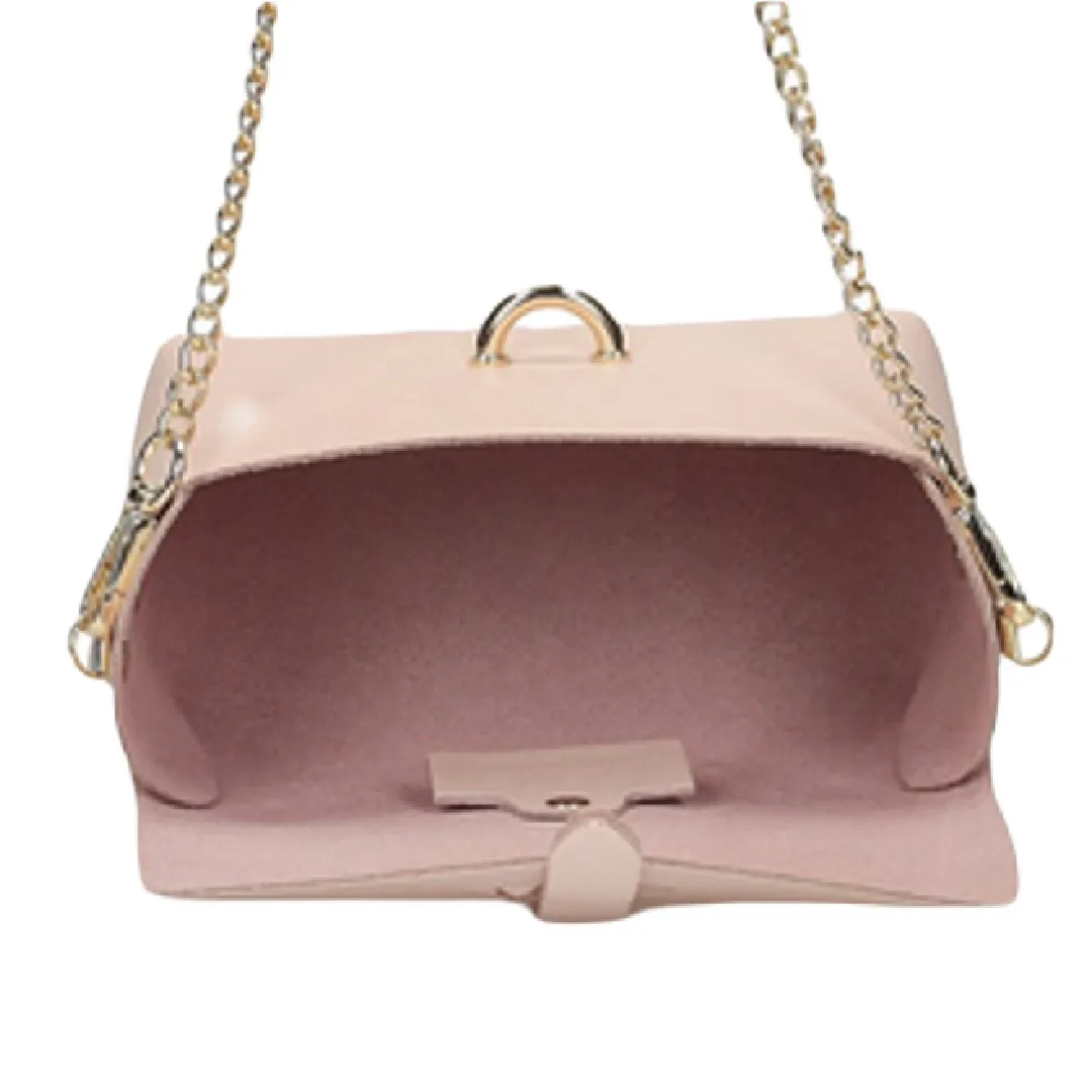 Model wyróżnia się unikatową konstrukcją – brak tradycyjnych szwów, a całość została złożona przy użyciu złotych metalowych klipsów, co nadaje torebce nowoczesnego, designerskiego wyglądu. Torebkę można nosić na ramieniu dzięki złotemu łańcuszkowi o długości 130 cm, który w razie potrzeby można odpiąć.